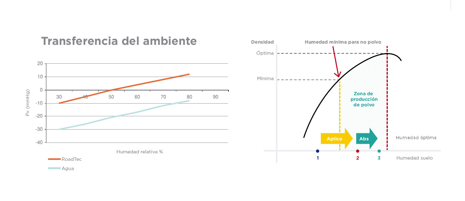 RoadTec es higroscópico (absorbe humedad), posee una alta tensión superficial, baja presión de vapor y forma una fuerte película de humedad.